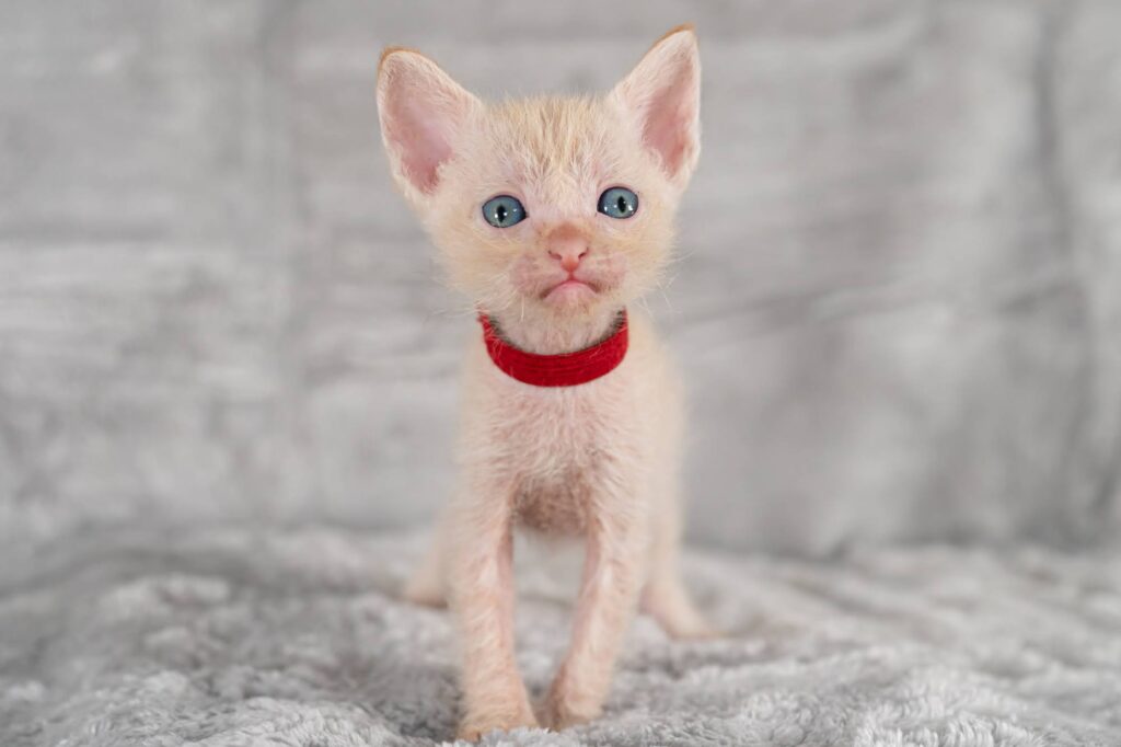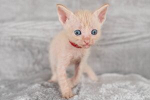 明るいオレンジの毛色でゆるふわ巻毛が可愛い男の子です。まだまだ薄毛ですが成長と共にゆるゆるとカールした珍しい巻毛猫に成長する予定です。